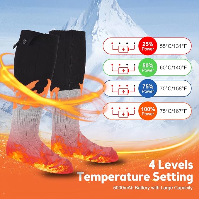 - 🔥【4 Temperature Settings】The rechargeable heated socks have 4 temperature settings: 131°F, 140°F, 158°F and 167°F, so you can choose the temperature you want based on weather conditions and personal preference, which reduces blood circulation Especially important in cold weather. No matter how cold the weather gets, you can rely on these electric heated socks to keep your toes comfortable.