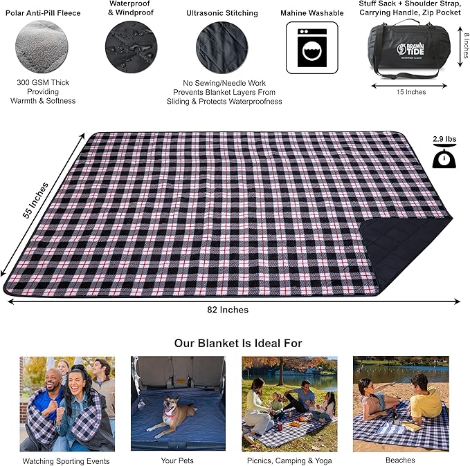 BRAWNTIDE Large Outdoor Waterproof Blanket - Quilted, Extra Thick Fleece, Warm, Windproof, Sandproof, Includes Stuff Sack, Shoulder Strap, Ideal for Beaches, Picnics, Camping, Stadiums, Dogs, Car