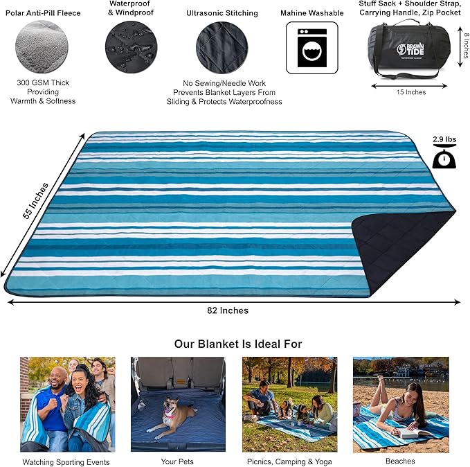 BRAWNTIDE Large Outdoor Waterproof Blanket - Quilted, Extra Thick Fleece, Warm, Windproof, Sandproof, Includes Stuff Sack, Shoulder Strap, Ideal for Beaches, Picnics, Camping, Stadiums, Dogs, Car