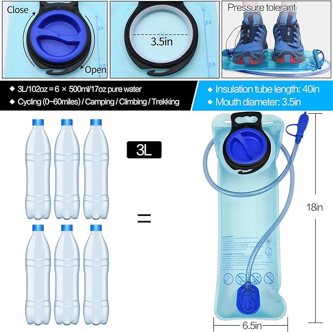 - 【Package Include】- Package includes 1 pack 3L blue hydration bladder. It is suitable for long-time outdoor activities, hiking, climbing, camping, cycling (0- 60miles), etc.