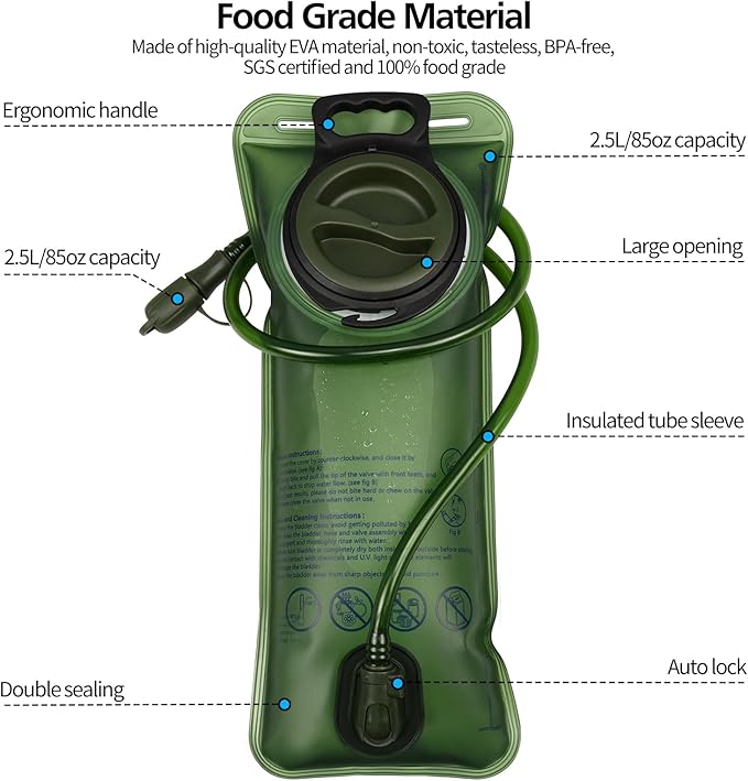 - 【Package Include】- Package includes 1 pack 2.5L blue hydration bladder. It is suitable for cycling (0-50 miles) as well as adventuring, etc.