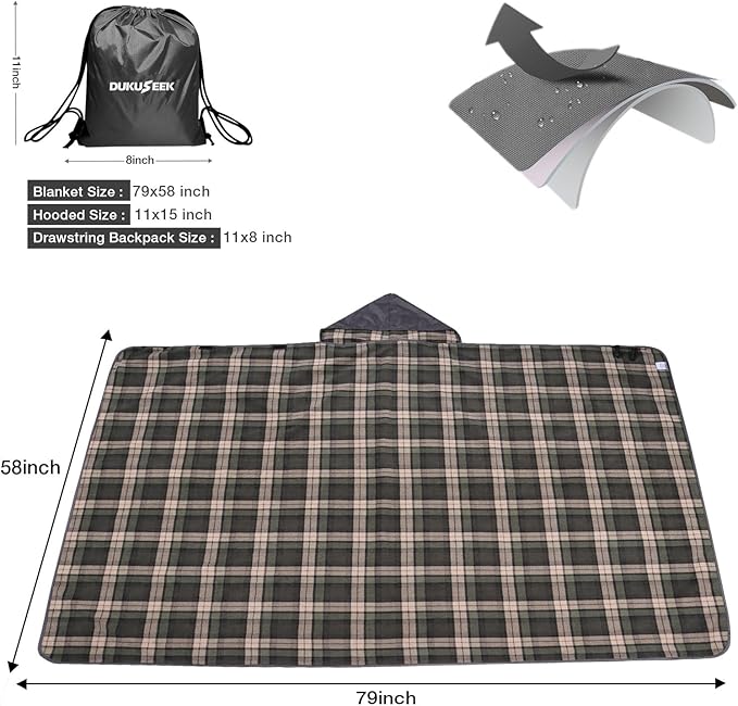 DUKUSEEK Stadium Blanket for Outdoor Sports, Waterproof Hooded Blankets, Windproof Warm Fleece Blankets for Camping Stadium, Beach, Picnic, Concerts, Car, Dog, 79"x 59"