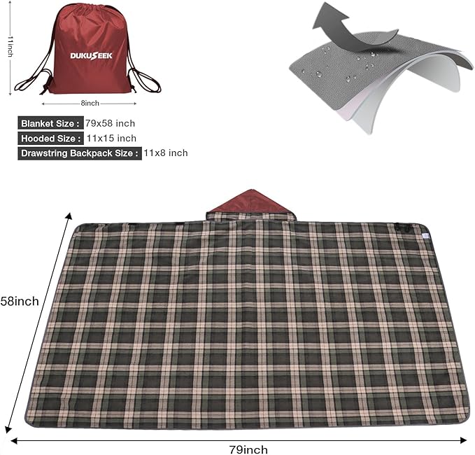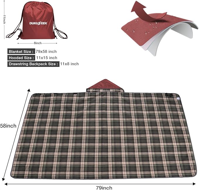 DUKUSEEK Stadium Blanket for All Weather, Waterproof Outdoor Blankets with Hood, Soft Warm Fleece Camping Blanket Windproof for Outdoor Sports, 79"x 59"