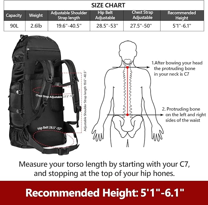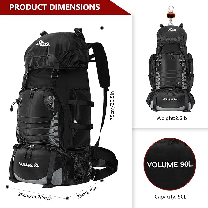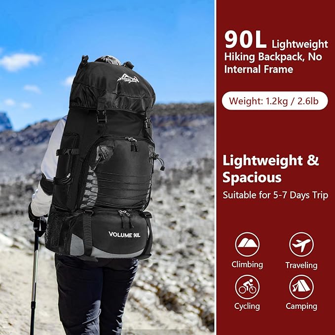 - 【Ideal & Outdoor Companion】: 90L ultra lightweight hiking backpack, only 2.6 pounds, no internal frame, reduces the load weight of backpack, allowing you to carry more other items. 90L large hiking backpack size: 75x35x25cm/ 29.5x10x13.8x inches. Enough for a 5 or 7 days trip. The maximum loading bearing is 45lb. Suitable for travel, hiking, mountaineering, camping and everyday use. Note: Please confirm the product size indicated on this page before ordering.
