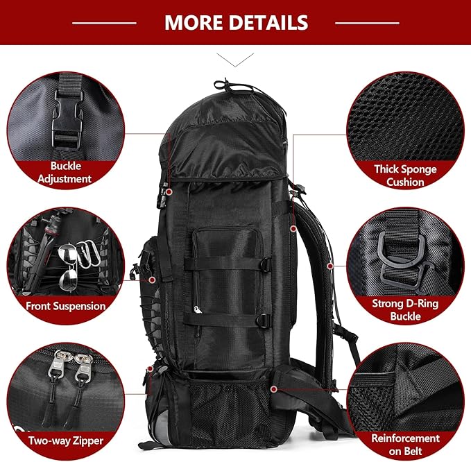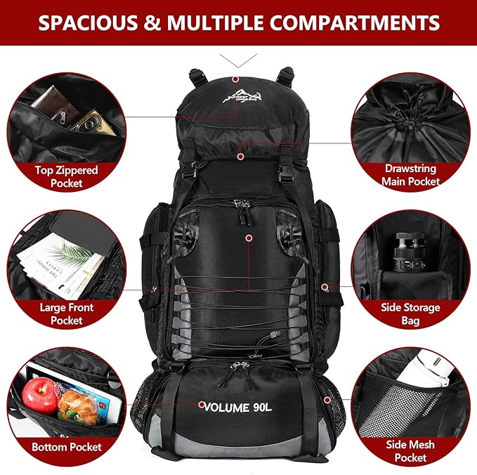 - 【Large Capacity & Multicompartment】: 90L travel backpack is designed with spacious main pocket and multiple compartments for easy storage. The hiking bag has 8 large compartments, Including 1x top pocket, 1x drawstring main pocke, 1x front pocket, 1x shoes bottom pocket, 2x side water bottle pockets, 2x side ziper pockets. Partition storage, easy to store, more tidy!