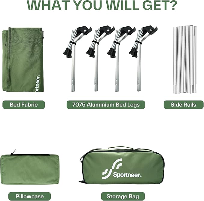 - More Sturdy & Steady: Enjoy the pinnacle of quality and comfort the Sportneer camp folding cot. The portable backpacking cot legs boast exceptional aerospace-grade 7075 aluminum alloy while the lightweight sleeping bed surface is expertly constructed tear-resistant 300D elastic polyester fabric, reinforced PU coating. This winning combination ensures unparalleled stability and durability, supporting a maximum weight of 330 pounds.