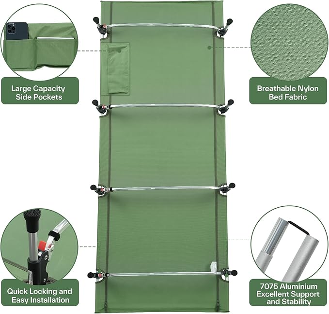 - Effortless Setup & Portability: Our innovative lever locking mechanism allows you to connect the legs and supporting bars, tighten the camping cot surface securely out sagging, and easily disassemble it by pressing the trigger structure. the included storage bag, you can easily pack the camping cots for adults away and hit the road!