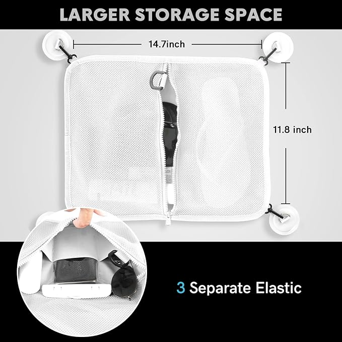 - Enough Storage Space: The paddle board deck Bag is large enough for phone, sandals, water bottles, sunscreen,snacks and sunglasses and so on, Paddle board Mesh Storage Bag size is 11.8”*14.8”. Especially design with 3 separate elastic mesh pockets inside for fixing small gear and a hook for keys.