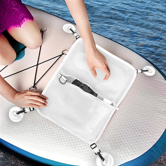- Durable and Stable: The SUP deck bag is made of 900D Oxford and mesh. This sup Accessories Mesh Storage Deck Bag is durable enough for any paddling adventure. Come with a waterproof phone case to keep your essentials like your phone dry. Please check and test the phone case before you using it.If any problem, contact with us directly.