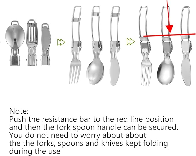 - 【EASY TO CARRY】All pots and frying pans in this cooking set are designed with foldable handles for easy storage. All the forks knives spoons are foldable and can be easily packed into the cloth bags for simple storages. All the camping kit can be stored in one small package and putted in the mesh bag for easy carrying.