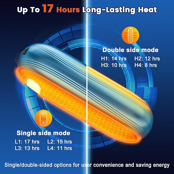 - 【 Experience Prolonged Warmth! 】Our reusable hand warmer delivers rapid 2s heating. After a 3-4 hrs charge, it provides up to 17 hours of continuous warmth! Opt for dual-side heating (H1/H2/H3/H4) to enjoy 6 to 12 hours of all-around warmth. If you prefer single-side heating (L1/L2/L3/L4), you'll have 11 to 17 hours of warmth.