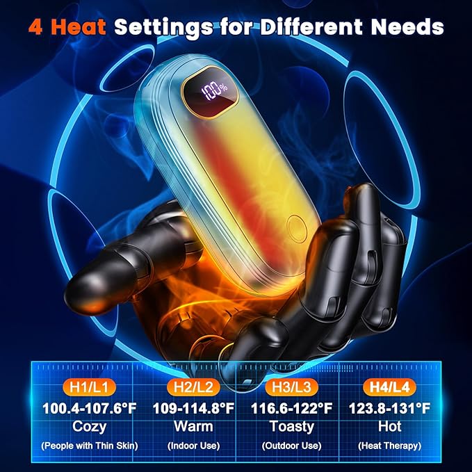 - 【Adjustable Heat Settings & Modes】4 heat levels (100-108℉/109-115℉/116-122℉/123-131℉), single/double side heating options, providing a total of 8 heating modes, whether you need a gentle warmth for everyday use or a high heat blast to combat freezing conditions, just 2s fast heating, our electric hand warmers have you covered.