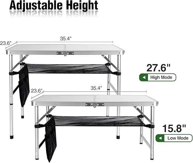 - 2 Adjustable Height: With 4 sections of adjustable feets, the entire table height can be extended from 15.8’’/40cm to 27.6’’/70cm, meeting the height requirements of different scenarios. With upgraded hexagonal legs with anti-slip cover, this outdoor folding table feature excellent cushioning effect and stability.