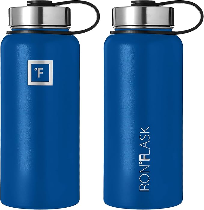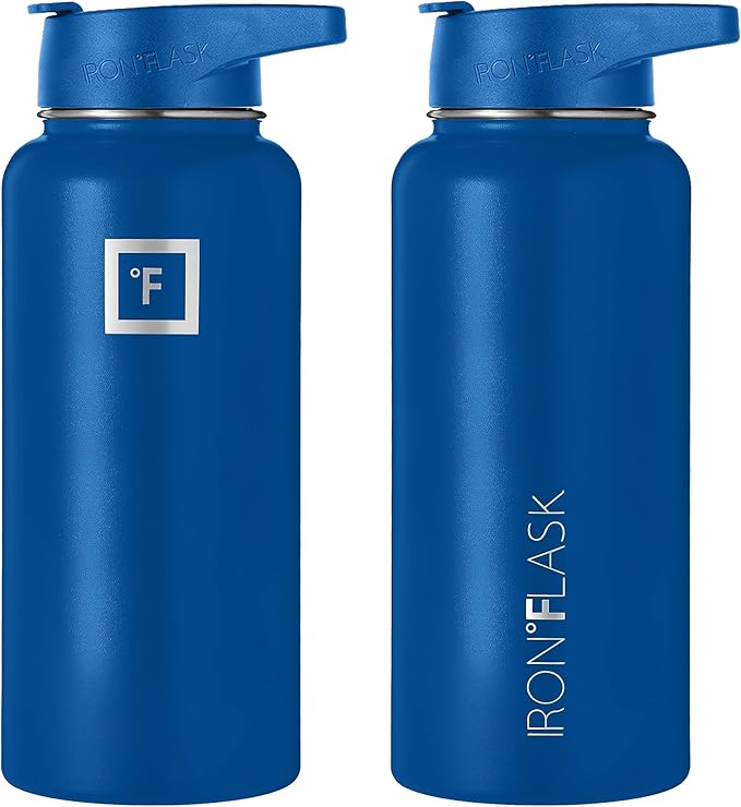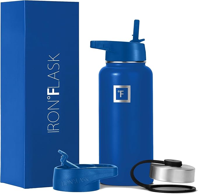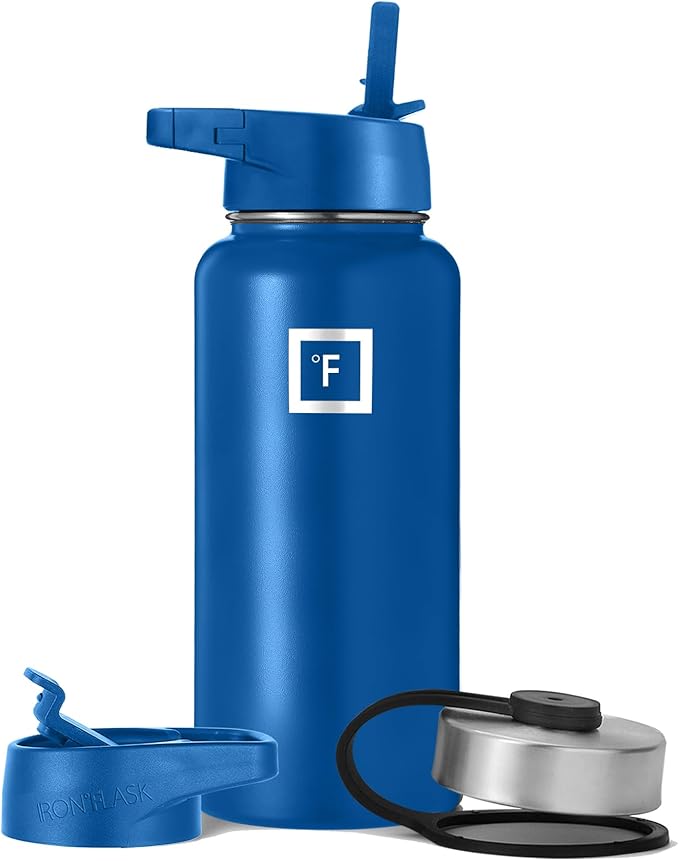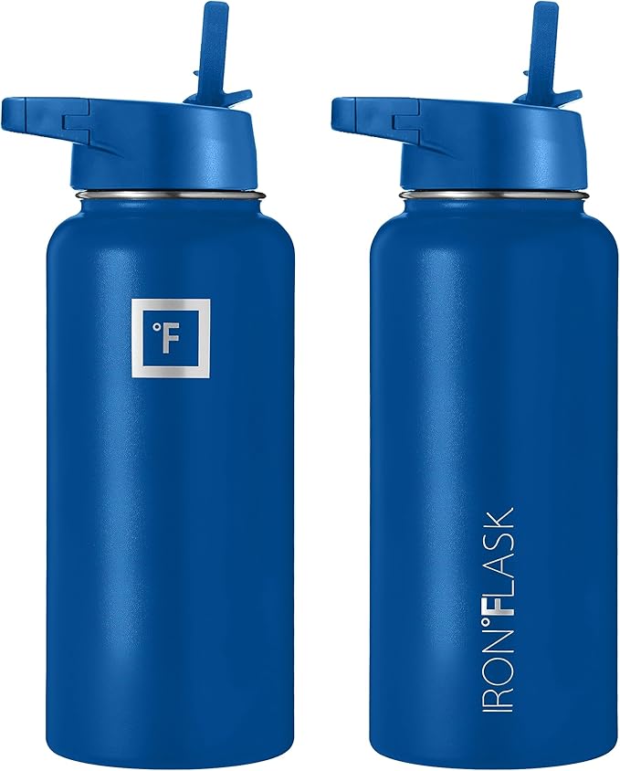 IRON °FLASK Camping & Hiking Hydration Flask, Wide Mouth, 3 Straw Lids, Stainless Steel Outdoor Water Bottle, Double Walled, Insulated Thermos, Metal Canteen - Cobalt, 32 Oz
