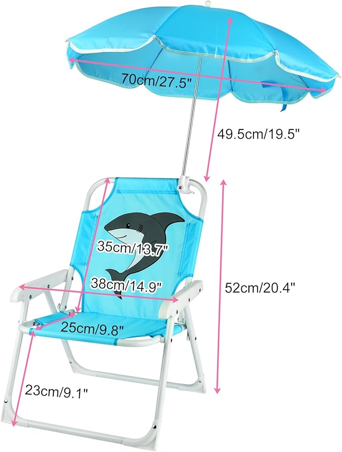 - This blue children's beach chair with umbrella is specially designed for children, and the shark pattern is printed on the chair, which is easy to attract children's attention. Sturdy, lightweight, and easy to fold, this outdoor chair is perfect for beach trips or camping.Suitable for children aged 1-5 years old