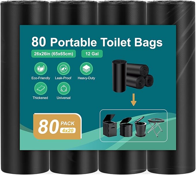 80 Portable Toilet Bags, Camp Toilet Liner for Porta Potty, Bucket Toilet, 1.2 Mil Disposable Trash Bag for Camping, Boating, Traveling, Outdoor Activities