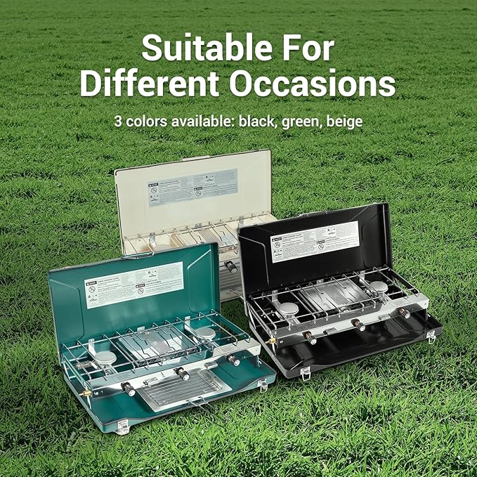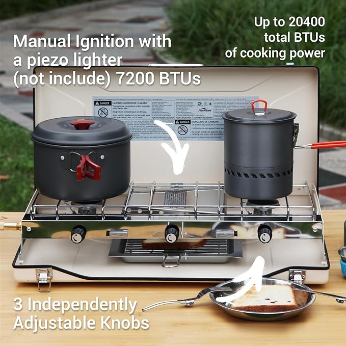 • ADJUSTABLE 3 BURNERS : This camping gas stove is equipped with 3 independently adjustable knobs, two of Piezo ignition burners with 6,600 BTU power. The middle downward burner is designed for toasting, 7200BTU power and requires manual ignition. We recommend that you use a piezo lighter. It relies on heat radiation to heat and won't burn the toast