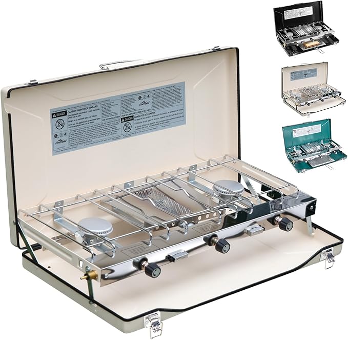 • PORTABLE: This 3-burner portable camping stove comes with a carry handle that allows you to carry it conveniently. It has a compact structure and weights only 10lbs which makes it even easier to carry it around. It can be taken along in a luggage or storage box, or even large tote bag, so carrying this portable propane camping stove is a breeze thing to do! Size: 23.4”x12.8”x3.4", Weight:9.9 LB