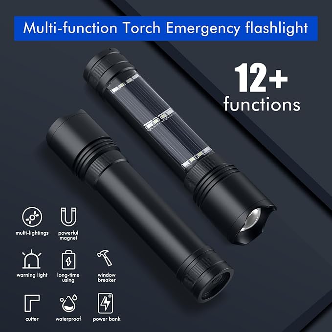 - 【Rechargeable Power Bank】: This solar flashlight could be charged with included USB Cable (4-5hrs) or Solar Power (30hrs), using the USB cable to connect your phone with the flashlight (The battery needs to be greater than 20%)and charging your phone for emergency.