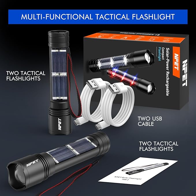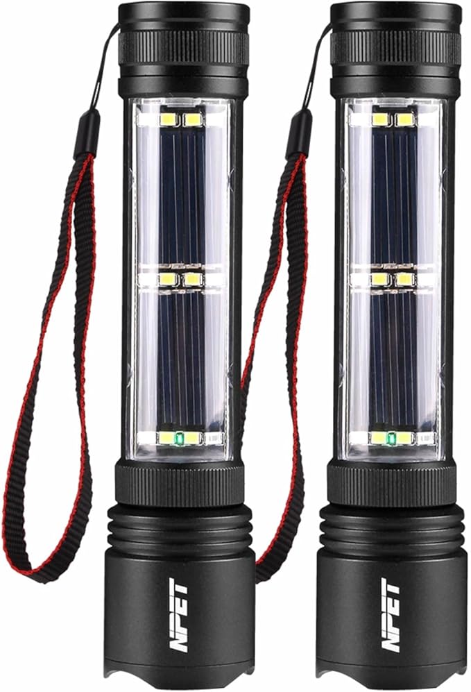 NPET T08-2 Solar Power Flashlight Car Flashlight USB Rechargeable Tactical Multi-Function Torch Emergency Tool (T08-2pack)