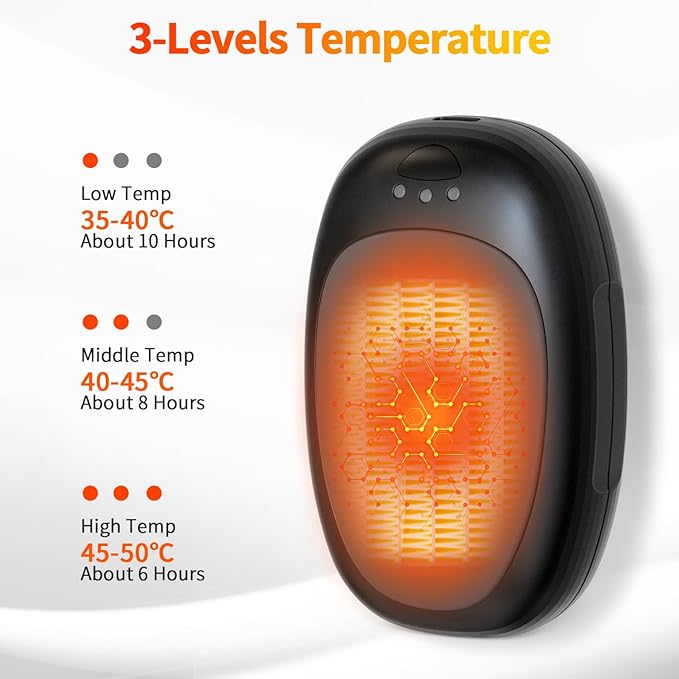 - 【2S Quick Heating Up】 Electric hand warmer with 3 modes of temperature, they are low temperature(35-40℃), middle temperature(40-45℃), high temperature(45-50℃) for you to choose. It will heat up in 2 seconds and provide warmth for you after long press the button.