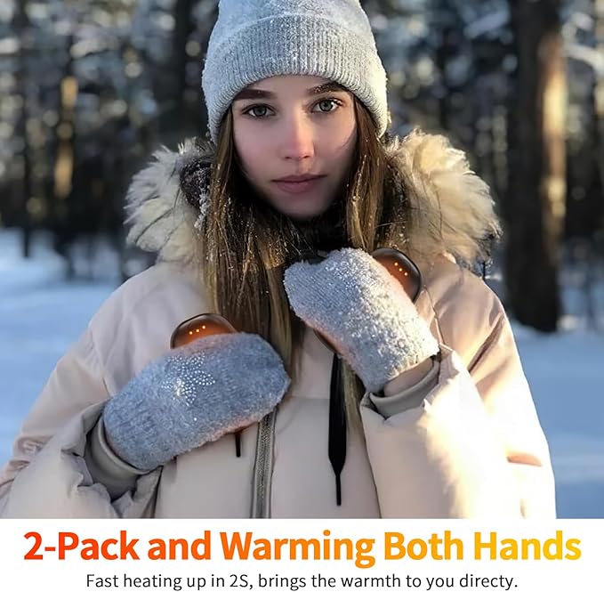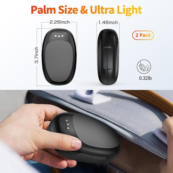 - 【Upgraded Hand Warmers 2 Pack】 Rechargeable hand warmers designed with double-sided heating, you can merge them to get one hand warmer, or separate it to have two reusable hand warmers, which can provide warmth for your both hands. It is palm size and ultra light, you can easy to put into your each pocket.