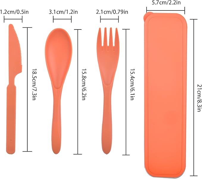 - Package Includes: 4 set of portable cutlery with green gray orange yellow. Each cutlery case set is included one fork, one spoon, and one knife. That plastic texture Eco friendly reusable portable cutlery set have beautiful colour to increase appetite.