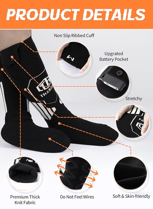 - IDEAL FOR OUTDOOR COLD-WEATHER ACTIVITIES:Electric heated socks provide warmth but also stimulate blood circulation in the feet, especially good for people who suffer from poor circulation, frostbite, Raynaud’s, arthritis and chronically stiff joints. Stylish unisex heating stockings are a thoughtful gift for loved ones who enjoy being outdoors regardless of the weather. Can be used for cycling, climbing, hunting, ice fishing, motorcycling, snow skiing and more.