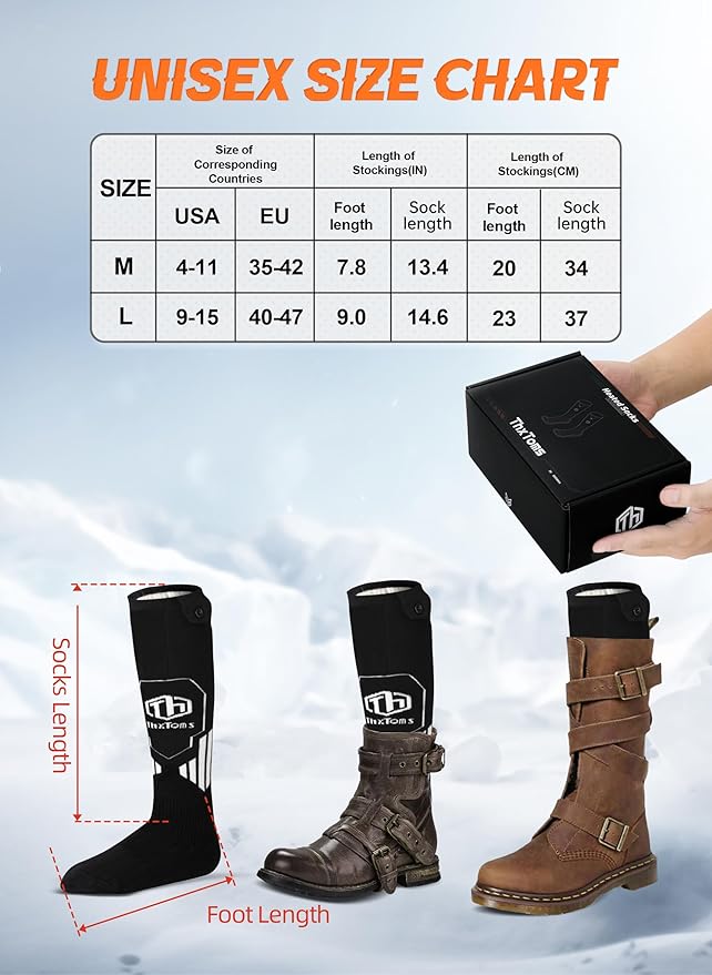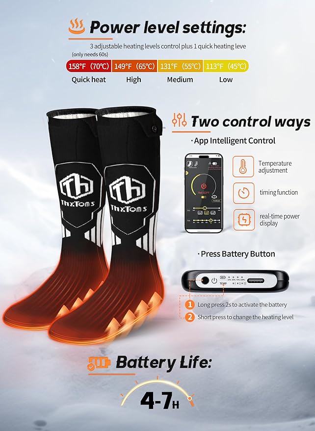 - ADJUSTABLE 3 LEVEL HEAT SETTINGS PLUS 1 QUICK MODE: ThxToms Heated Socks come with an exclusive APP that allows you to adjust the temperature within a range, set the timing, and turn on/off without having to remove your socks. It offers three-level heat controller, including low heat(113° F, 8hrs), medium heat( 131° F, 6hrs), high heat( 149°F, 4hrs), allowing you to customize themperatures at will.