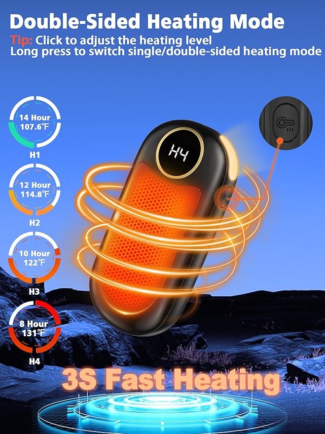 - 2 Sided Heating & 4 Heating Levels: The hand warmer reusable has 8 heating modes, 4 heating levels, and can heat up to 131 ℉. L1/L2/L3/L4 for single sided heating. H1/H2/H3/H4 is used for double-sided heating. Rechargeable hand warmer heats up quickly in 2 seconds. With the help of the LED display, you can check the remaining power and easily adjust the heating mode, free your battery anxiety