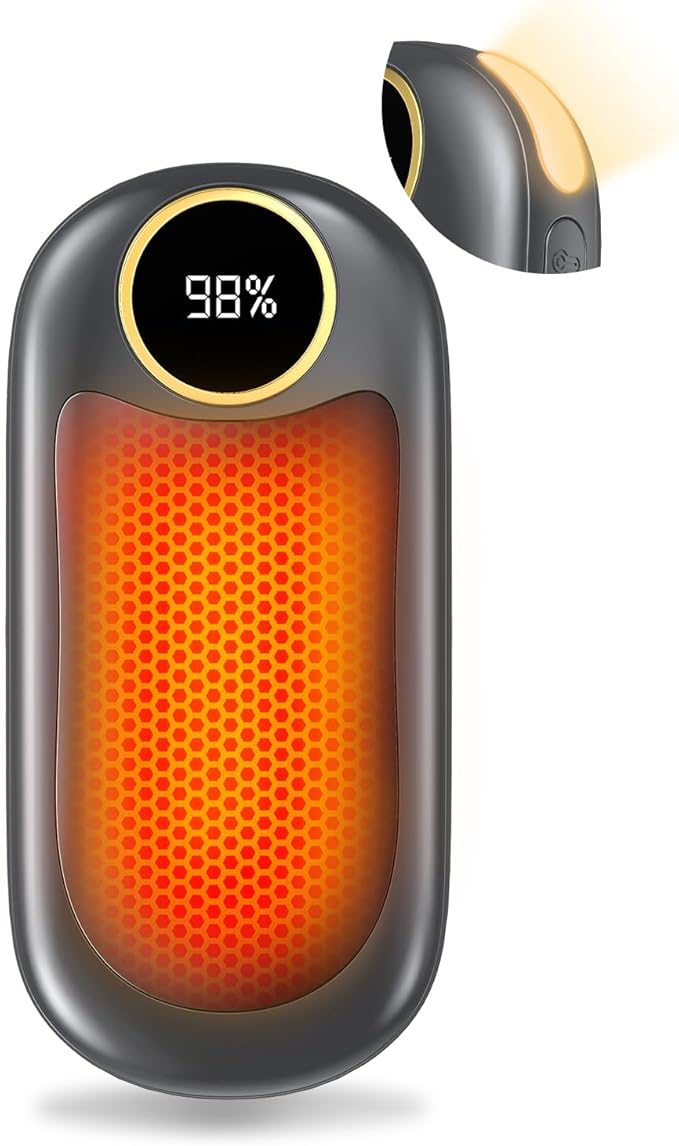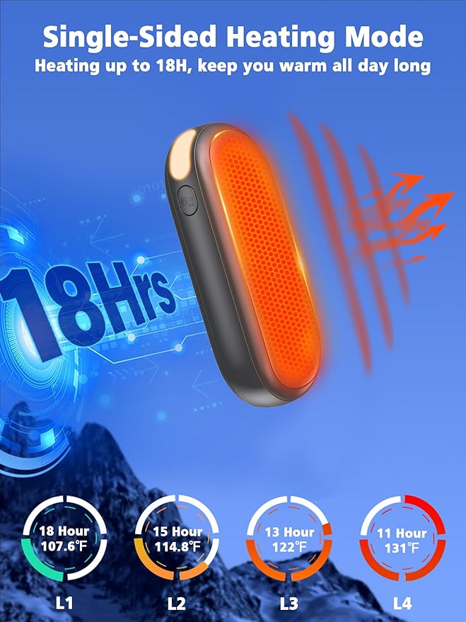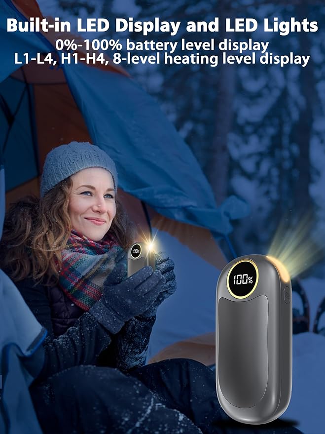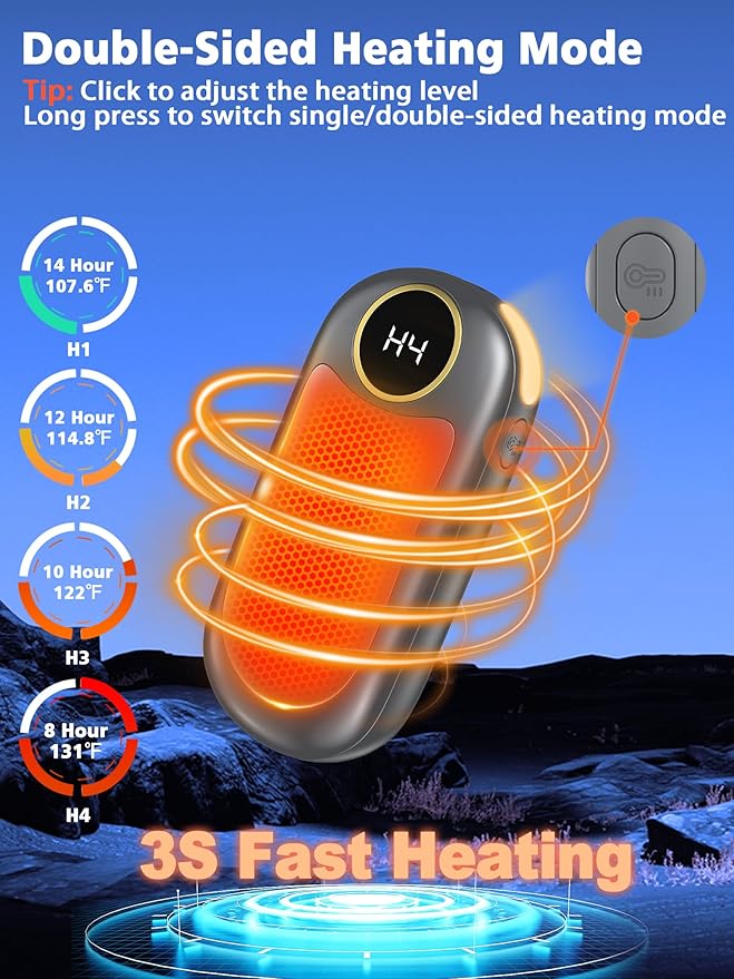 • 2 Sided Heating & 4 Heating Levels: The hand warmer reusable has 8 heating modes, 4 heating levels, and can heat up to 131 ℉. L1/L2/L3/L4 for single sided heating. H1/H2/H3/H4 is used for double-sided heating. Rechargeable hand warmer heats up quickly in 2 seconds. With the help of the LED display, you can check the remaining power and easily adjust the heating mode, free your battery anxiety