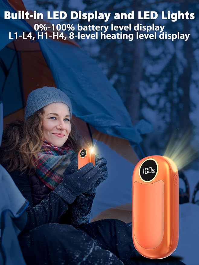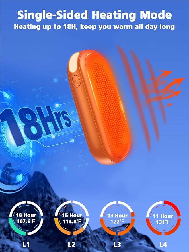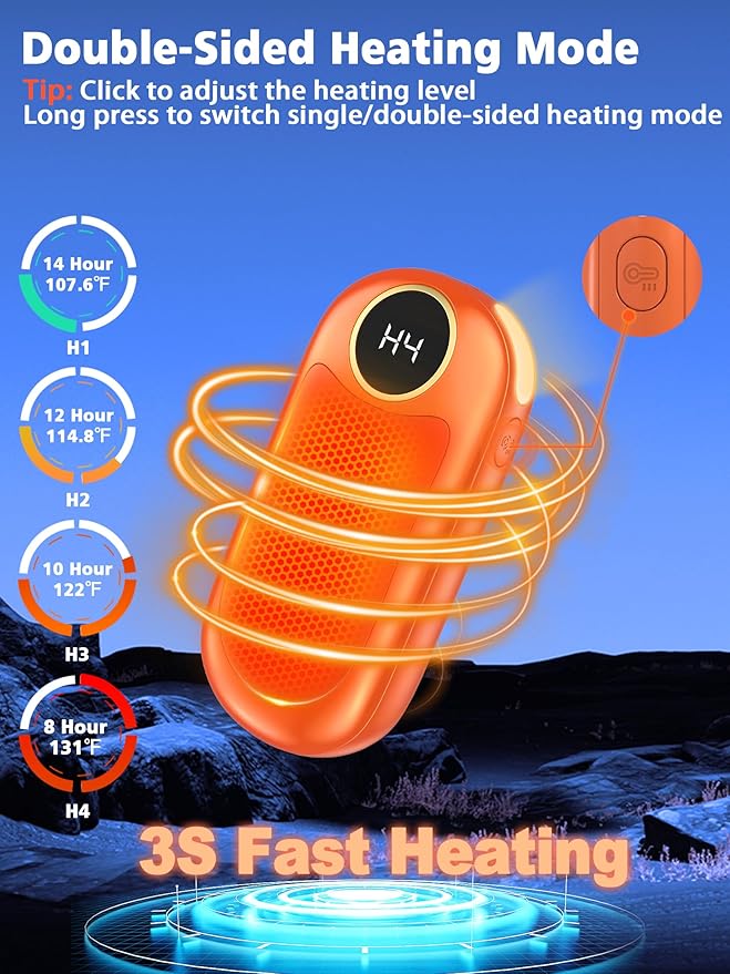 - 2 Sided Heating & 4 Heating Levels: The hand warmer reusable has 8 heating modes, 4 heating levels, and can heat up to 131 ℉. L1/L2/L3/L4 for single sided heating. H1/H2/H3/H4 is used for double-sided heating. Rechargeable hand warmer heats up quickly in 2 seconds. With the help of the LED display, you can check the remaining power and easily adjust the heating mode, free your battery anxiety