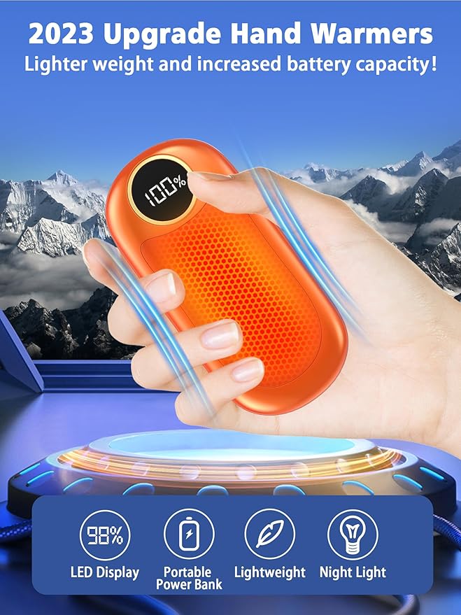 - Multifunctional Hand Warmers Rechargeable 2 Pack: Using advanced temperature control chips to accurately control the temperature, whether you are outdoors or indoors, it can warm your hands and keep the cold away. It can be used as an emergency power bank when you are out, charging your mobile phone or other devices at any time. Our electric hand warmers built-in LED light which can provides lighting in the dark