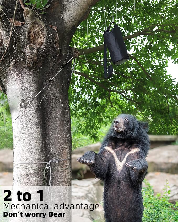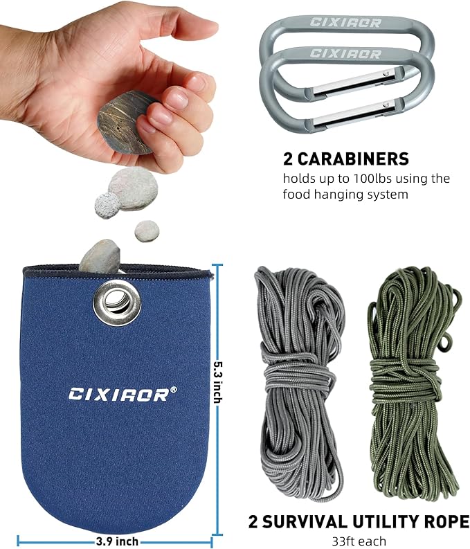 - 【Easy to use】Put a few rocks into the Cixiaor sock bag, tie off the rope and easily toss the bear sack over a branch. (The height that the bear can't touch)Then our 2-to-1 pulley system makes it as easy as possible to raise your bear bag. The ropes and carabiners act like a pulley - meaning you only need half the pulling force to raise your bear proof bag
