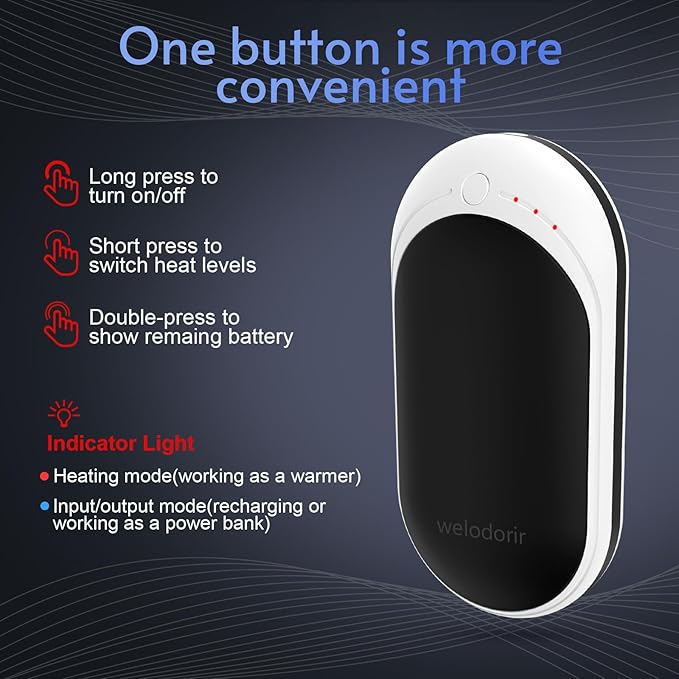 - 3 LEVELS TEMPERATURE HAND WARMER - Press the switch and No more cold hands! 3 levels of temperatures [95~108℉ (35~42℃)], [104~118℉ (40~48℃)], 119~130℉ (48~55℃)] at your choice. 3 indicator lights keep you informed of the hand warmer battery and heating status.Double-Sided heating design electric hand warmer reaches the temperature you want very quickly.Lightweight and sleek design can easily fit in your pocket or stay fixed in your glove.