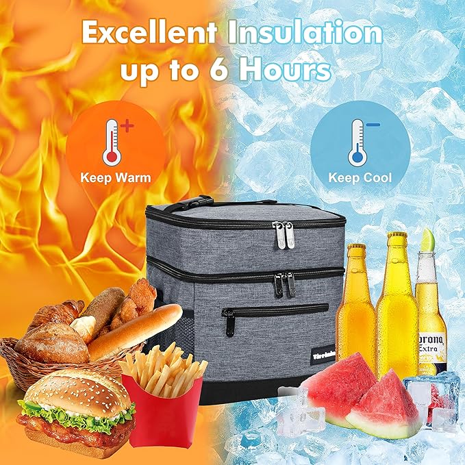 - Large Capacity Double Layer Lunch Box - This unisex insulated bag comes with 2 thermal compartments, which can be used for different purposes and separate hot and cold food, drinks, beverages, etc. The reusable lunch bag measures 9.85*8.72*10.63 inches and has a high capacity of up to 17L. Additionally, it features mesh pockets on both sides and a front zipper pocket, making it easy to store all the lunches or picnic essentials you need.