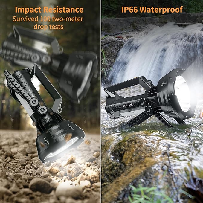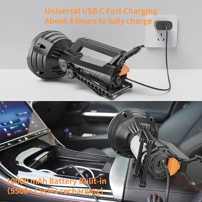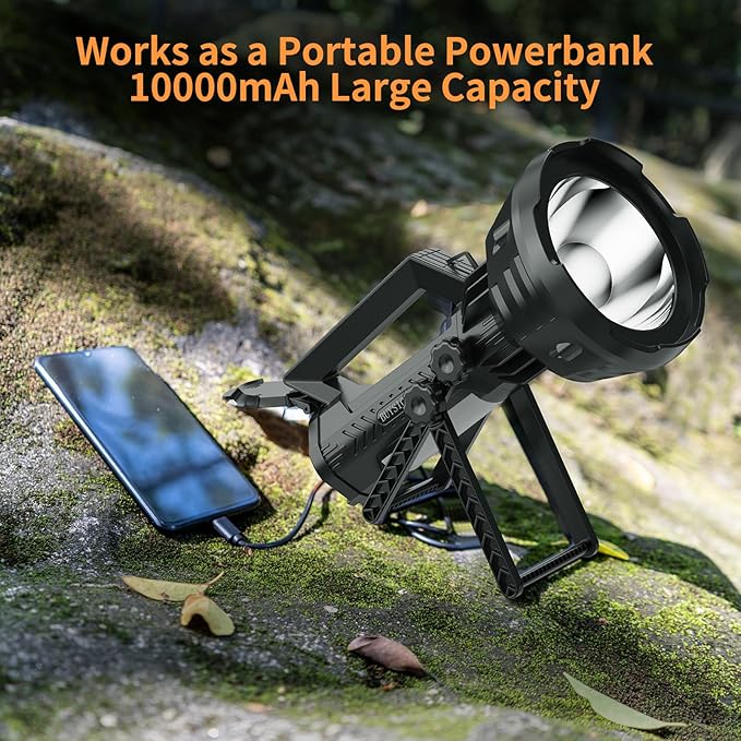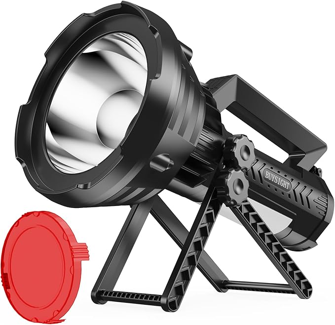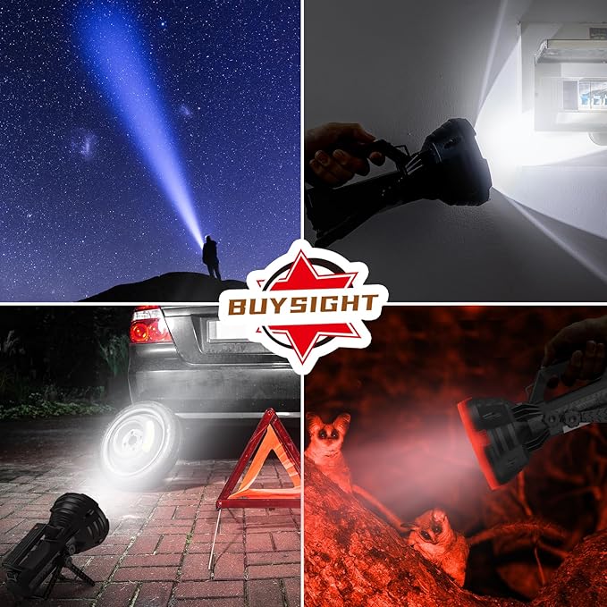 BUYSIGHT Rechargeable Spotlight Flashlight, 1000,000 lumens 600 Yards Range IP65 Waterproof Spot Lights Handheld Large searchlight with red Lens Side Flood Light Light USB C Recharge (Black Plus)