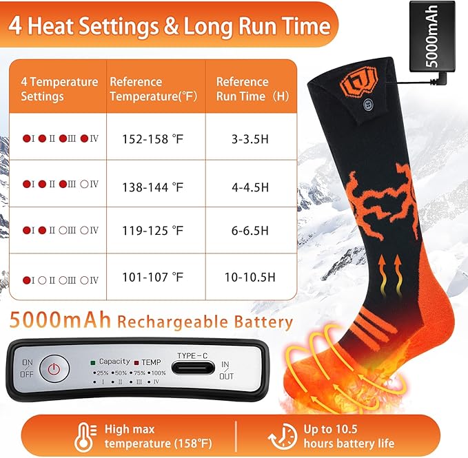 - 【𝟒 𝐇𝐞𝐚𝐭 𝐒𝐞𝐭𝐭𝐢𝐧𝐠𝐬 & 𝐔𝐩 𝐭𝐨 𝟏𝟎.𝟓 𝐇𝐨𝐮𝐫𝐬 𝐋𝐨𝐧𝐠 𝐑𝐮𝐧 𝐓𝐢𝐦𝐞】With 4 heat settings,the electric heated socks are your best partner for skiing, hiking, mountaineering, hunting, ice fishing, camping and working outside.The 5000mAh rechargeable lithium batteries provide reliable heat,you can feel the warmth in about 10 seconds, and within a few minutes, it reached the top and front of the feet and toes. The batteries can run for up to 10.5 hours on low power