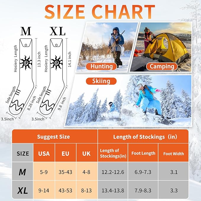- 【𝟐 𝐒𝐢𝐳𝐞𝐬 𝐀𝐯𝐚𝐢𝐥𝐚𝐛𝐥𝐞 & 𝐄𝐱𝐜𝐞𝐥𝐥𝐞𝐧𝐭 𝐄𝐥𝐚𝐬𝐭𝐢𝐜𝐢𝐭𝐲】Boasting slim batteries and a soft, comfy feel, our electric heated socks for men and women not only provide evenly distributed heat that won't falter in icy conditions,but also comfortably cushioned, with excellent compression on the calves.With excellent elasticity,these socks have 2 sizes available--M & XL.we recommend M size for 5-9, XL size for 9-14