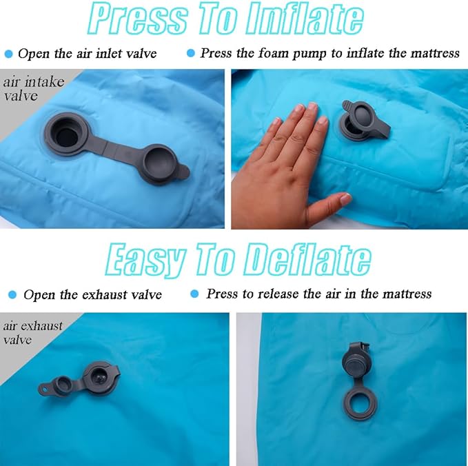 - 【EASY TO INFLATE/DEFLATE】Each double wide sleeping pad mattress has 2 valves, one for easy inflation with your feet or hands (no pump required) and the other for quick inflation and deflation