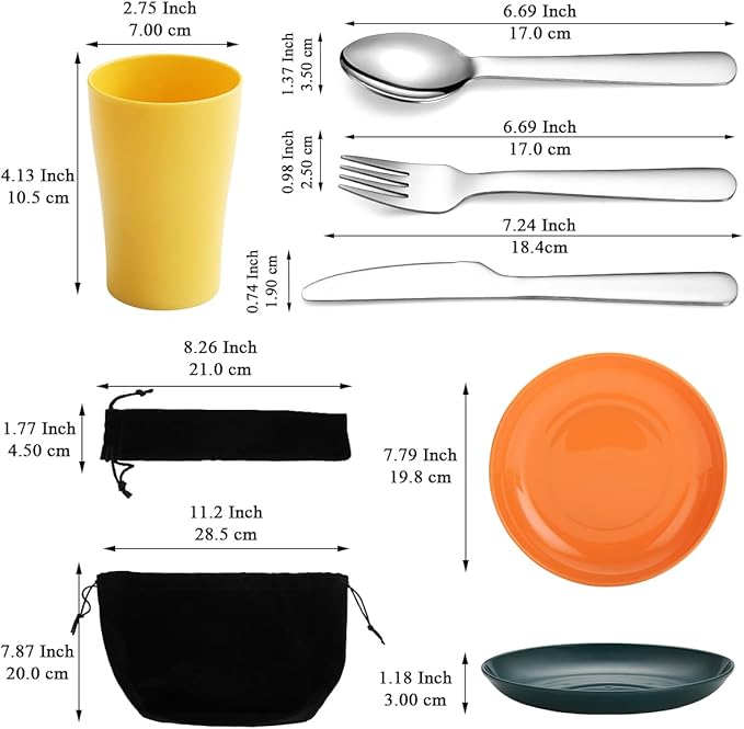 Camping Utensils Mess Kit, Including Camping Spoon, Fork, Knife, Plate and Cup Packed in a Portable Bag, Easy to Carry, Dishwasher Safe