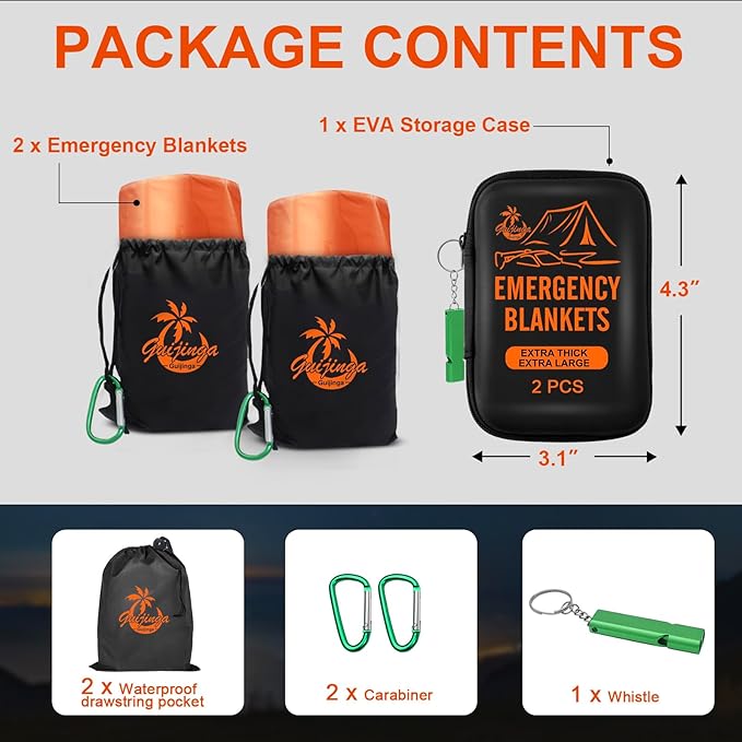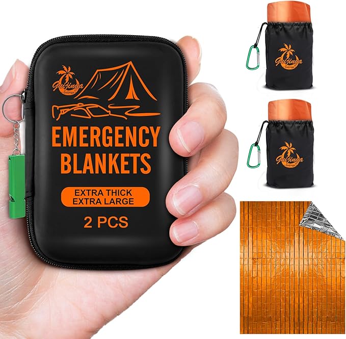 - 🔥【Extra Large & Extra Thick】: Guijinga products are 23% larger than other emergency blanket for car, offering 2-pack or 4-pack of 83" x 63" emergency blanket. survival blanket Made of premium PE material, they ensure durability and longevity, and sol emergency blanket 26-micron ultra-thick structure provides tear resistance, allowing you to protect yourself in harsh conditions.