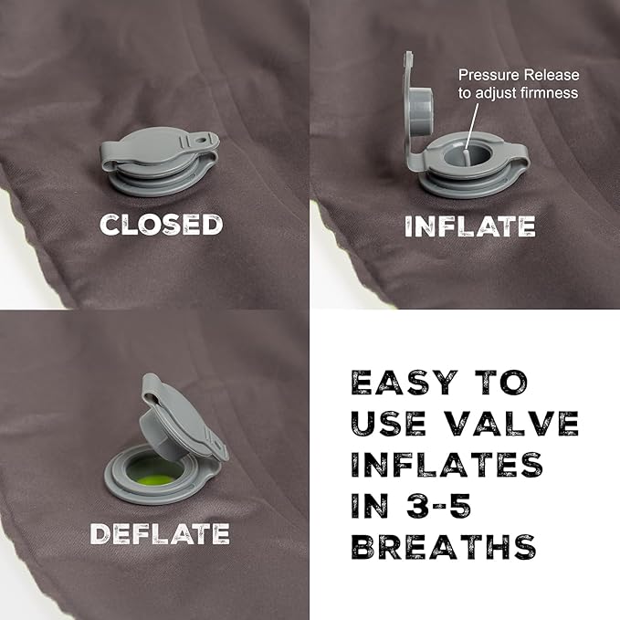 - EASILY INFLATABLE & ADJUSTABLE: This inflatable pillow is easy to inflate with just a few breaths. It is not a self inflating pillow. It quickly inflates and deflates for hassle-free setup and packing. The pillow features a convenient valve that allows you to adjust its firmness to your preference, ensuring a personalized level of comfort. Also it lets out all the air quickly with a dump-valve so it is easy to quickly pack and store. You don't have to wait for the air to release.