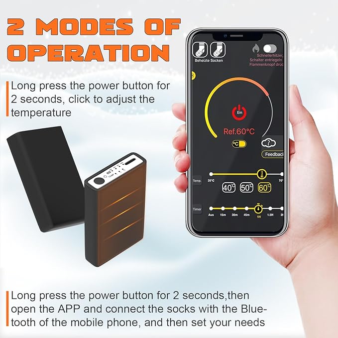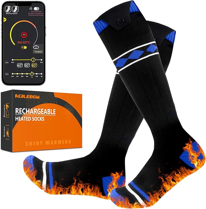 - 🔥〖SMART APP CONTROL 〗Electric socks are equipped with a smart APP, Using mobile phone APP to control the temperature and usage time of the heated socks, no more bending over in the snow to lift your trousers to look for the buttons inside the heated socks.