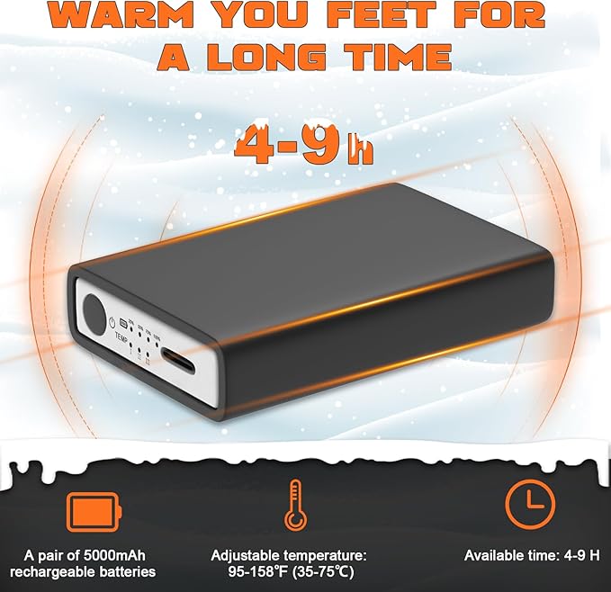- 🔥〖LONG BATTERY LIFE〗Battery socks are equipped with two 5000mAh super-capacity batteries, which provide up to 9 hours of warmth. Rechargeable heated socks are also equipped with a USB data cable, which can provide you with all-day warmth and comfort during long walks or travel.Wear these heated socks, you can enjoy the perfect level of warmth without the hassle.