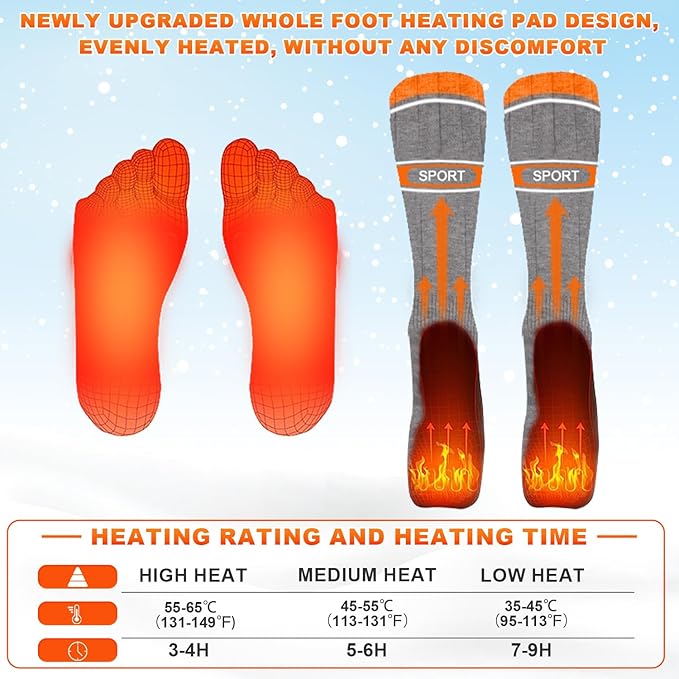 - Long-Lasting Battery Heated Socks: The mens heated socks equipped with a 5000mAh large-capacity battery, our electric socks offer over 9 hours of continuous warmth. You can confidently venture outdoors without worrying about your electric socks for men running out of power. Our heated ski socks are designed to keep up with your winter adventures.