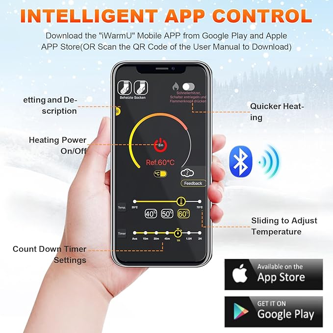 - APP Control Heated Socks: Gone are the days of struggling to find the battery compartment on your heated socks. With our intelligent control system, you can effortlessly adjust the time and temperature settings directly from your phone. Whether you need a quick boost of warmth or a sustained cozy sensation, our heating socks have got you covered. No more fumbling around in the cold to find hidden batteries!