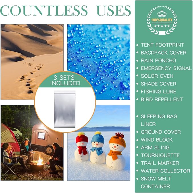 - Package Includes: there are 120 pack of space insulation blankets survival kit camping blankets; Each survival blanket is individually folded, wrapped and sealed for easy storage and retrieval; They are reusable, waterproof, windproof and can also be applied for ground coverings and shading