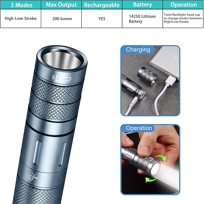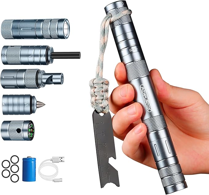 - 【What’s in the Box】: 1 x AbeuRox AB-T6 Camping Survival Kit Multitool, 1 x 14250 lithium rechargeable battery, 1 x USB-C Charging cable, 5 x O-rings, 1 x Paracord lanyard, 1 x Solid plastic tube as package case with all items packed in and well protected. Plastic tube itself makes a great storage case for small items like batteries, charging wires, etc
