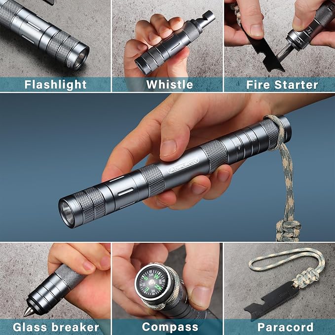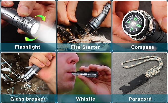 All in 1 Camping Survival Kits with LED Flashlight, Fire Starter, Whistle, Glass Breaker, Compass, Paracord, Tactical Survival Multitool, EDC, Stocking Stuffers and Gifts for Men Women